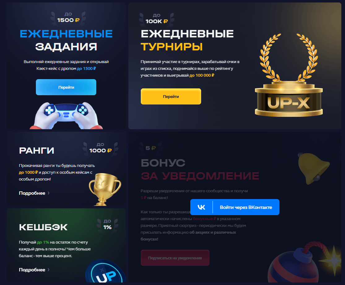Главный плюс для игроков Ап Икс – увеличение депозита. Вы получаете деньги на ставки в стандартных слотах, настольных и эксклюзивных играх.