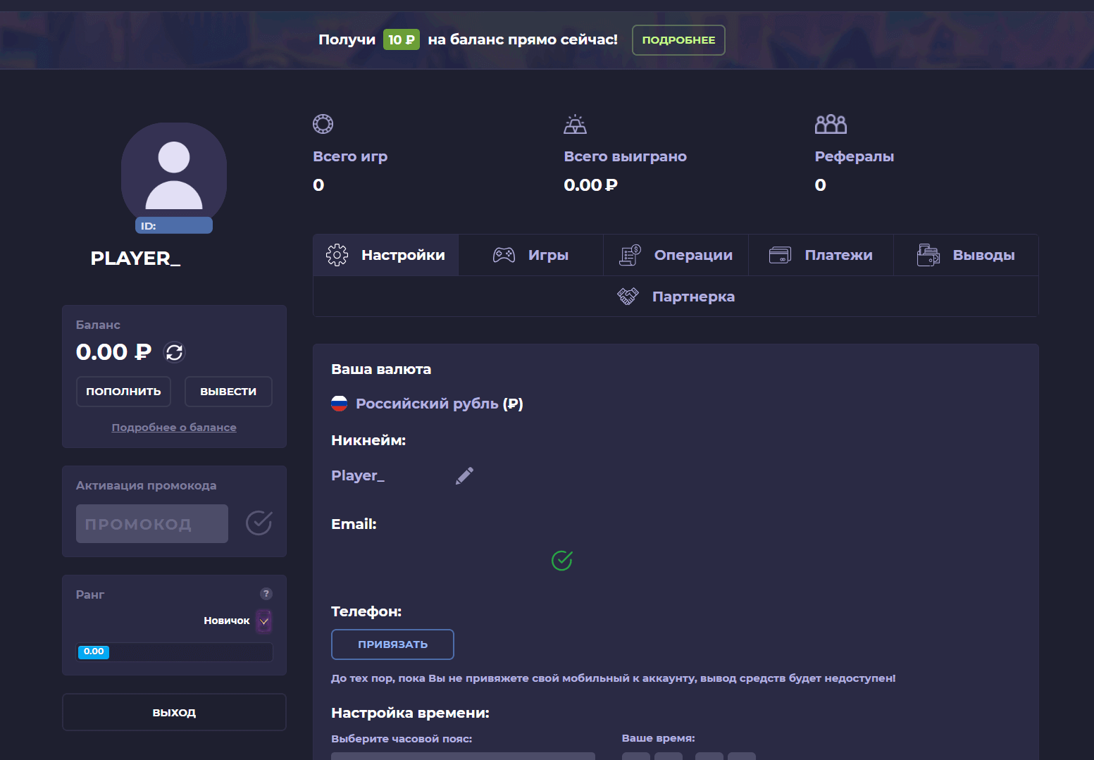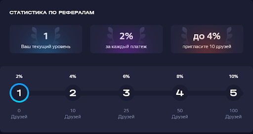 В ЛК участнику предоставляется персональная реферальная ссылка, предназначенная для приглашения новых геймеров. Потенциальный реферал должен перейти именно по этой ссылке, пройти регистрацию на сайте и внести первый депозит. После выполнения этих условий, пригласивший получает вознаграждение – до десяти процентов от суммы внесенного пополнения.