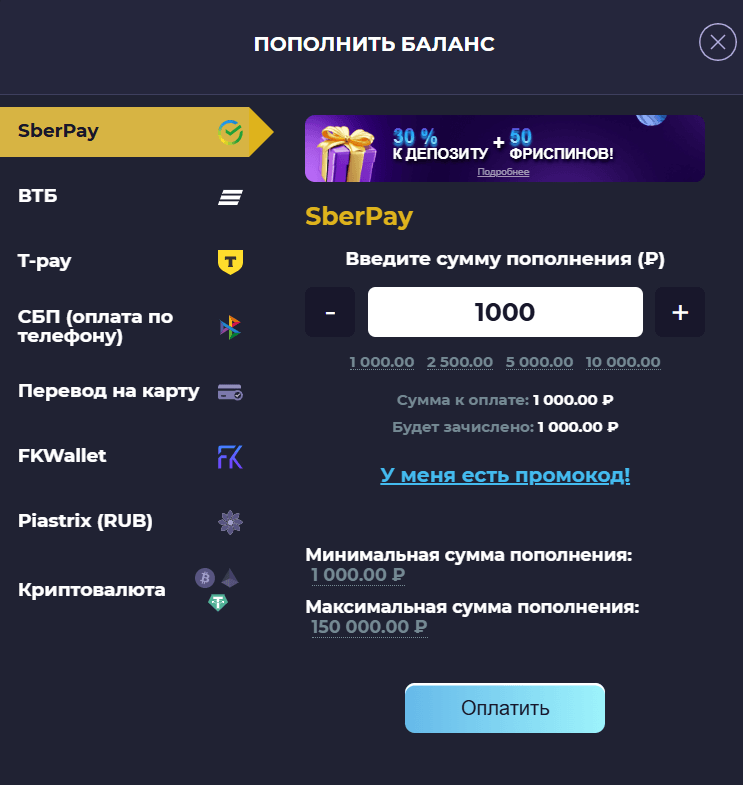 | 🎁 Популярный бонус | Приветственный – 50 фриспинов и +30% к депозиту |